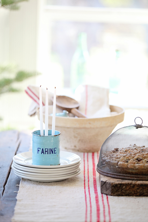 Vintage enamelware filled with flax seeds and candles