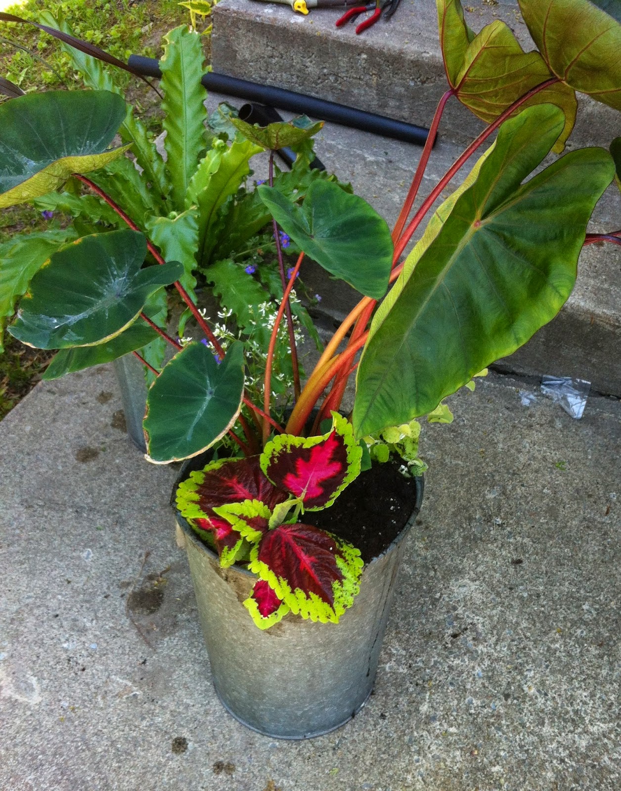 Zinc pots totally make this green with a smidge of red arrangement pop (close up shot).