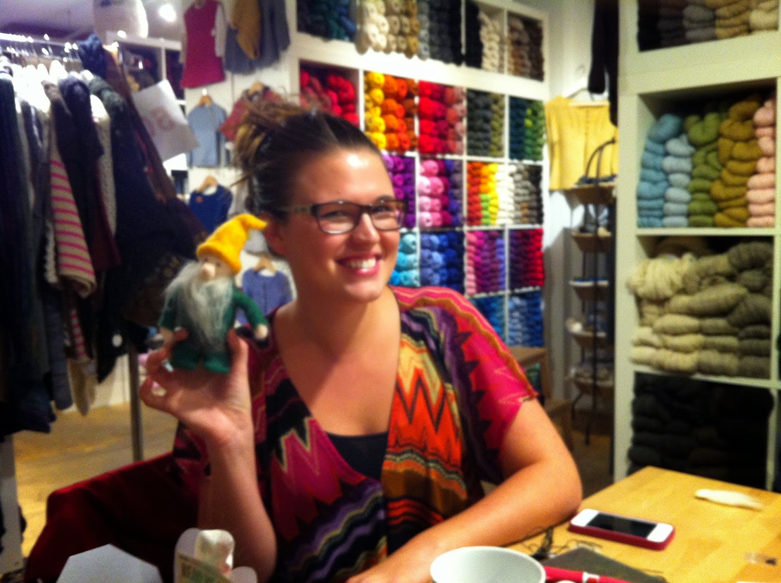 and finally this is our teacher - the lovely and talented Samantha who is holding this totally real looking gnome (admit it, you'd scream if you woke up and saw him at the foot of your bed) . Sam is a fiber genius. If there was a Superhero that improved peoples lives with knitted and felted stuff Sam would be it. Hey she already does that so I think I'll call her "Fiberwoman" (sorry Sam for when you read this!).